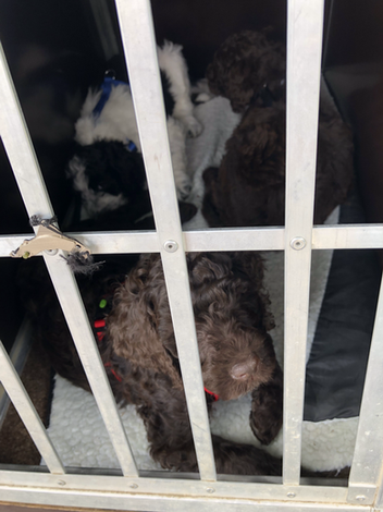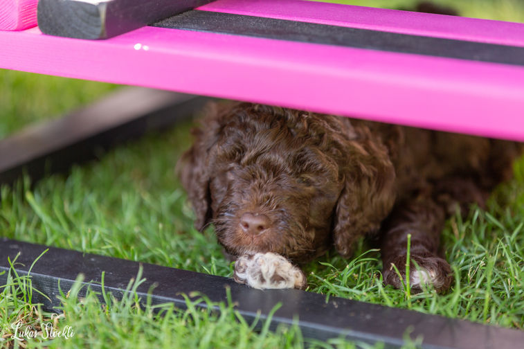 Nachdem alle Geschwister ausgezogen waren, gingen wir nach Deutschland und machten in Grafenwöhr die VAP F/H mit Kay. Natürlich durften alle Barbets mitkommen. Romy hatte ihren ersten abenteuerlichen Ausflug in Bayern. Sie hat sogar die Wachteln gefunden, die der Jäger versteckt hatte:)